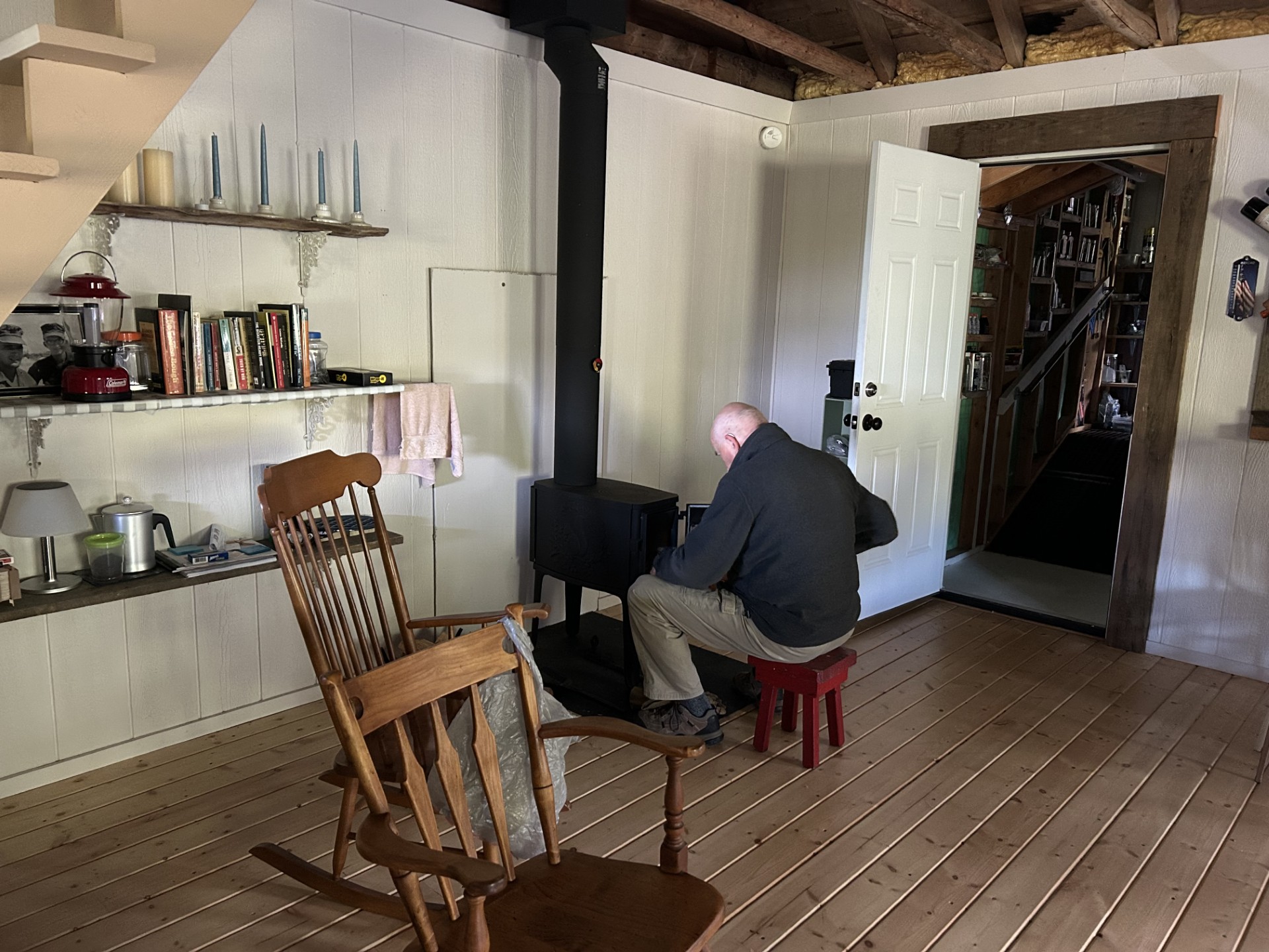 Banjo Man has taken advantage of cooler nights to spend a few extra weekend nights at the cabin and fire up the wood stove to cook his breakfast in the morning. He has a new bed and extra blankets, along with an array of pots, pans and a coffee pot. This year he has a new bookcase, along with a dozen books he plans to read before October.