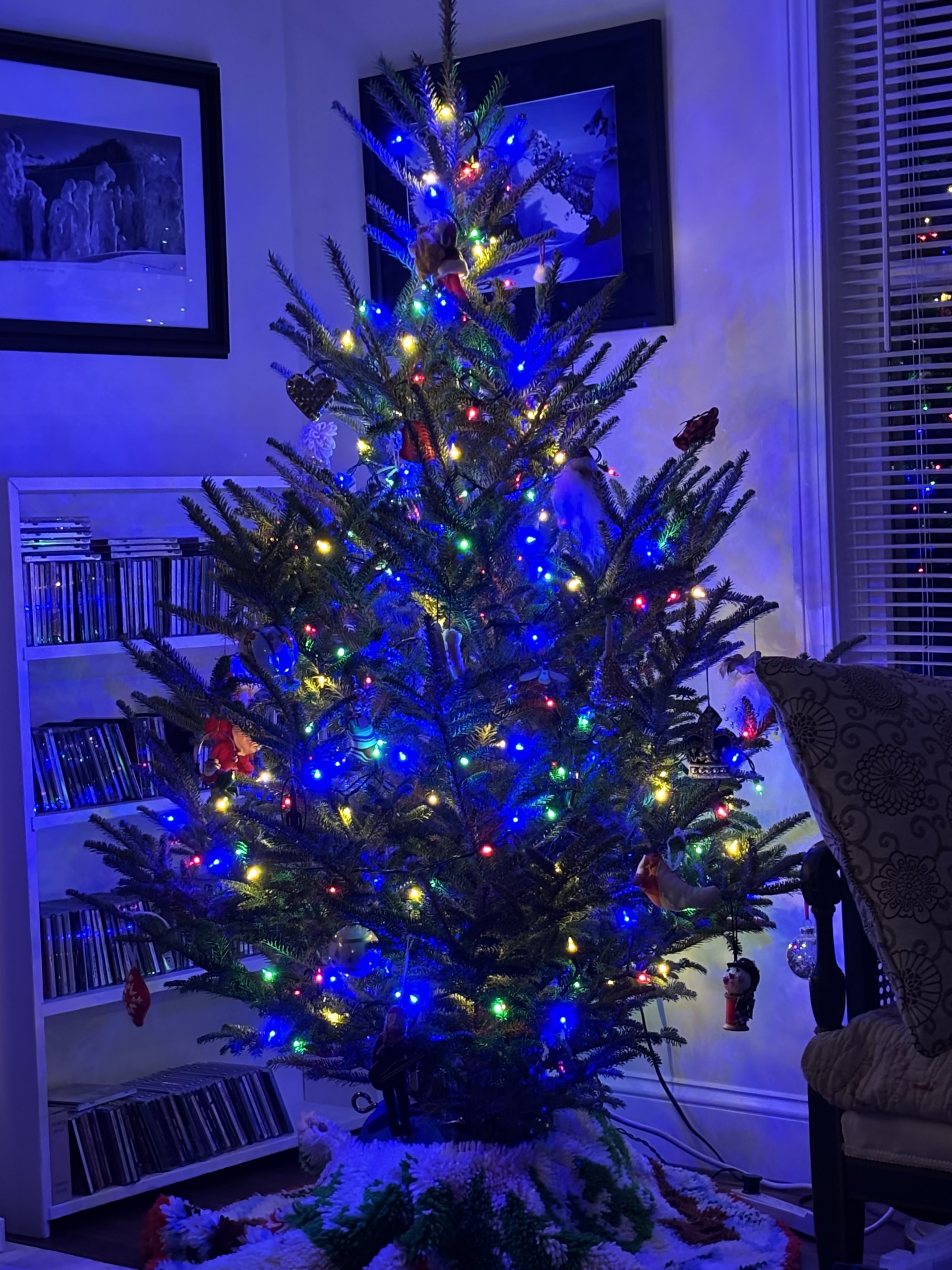 Our first live tree in decades is now tucked in the corner of the living room. What looked a bit scrawny in the tree lot now looks perfect.