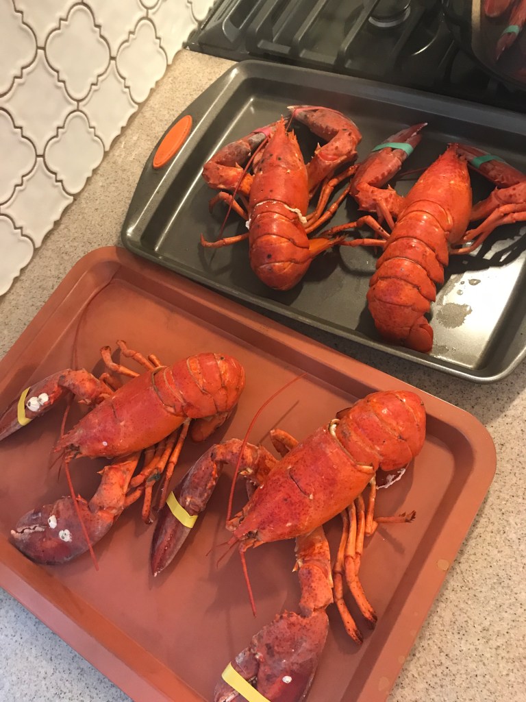 Yes, those are real lobsters in the pot. Angela texted me last night and asked if we wanted them, as she had no time to cook lobsters after a busy day at the hospital.