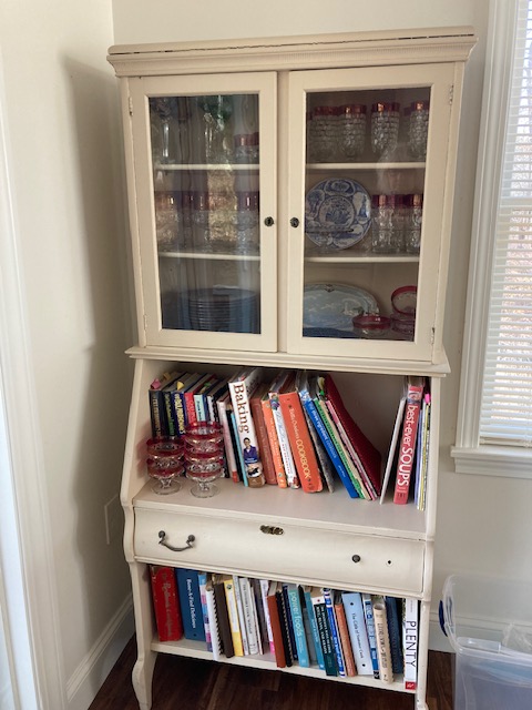 While football games blasted from the tv on New Year’s Day, I made a start emptying the cabinet that has lived for years in the corner of the dining area. Last month, when I realized that I no longer used my collection of ruby-flashed glassware, I also realized that when the ruby stuff went on to another home there would be little need for this piece of furniture.