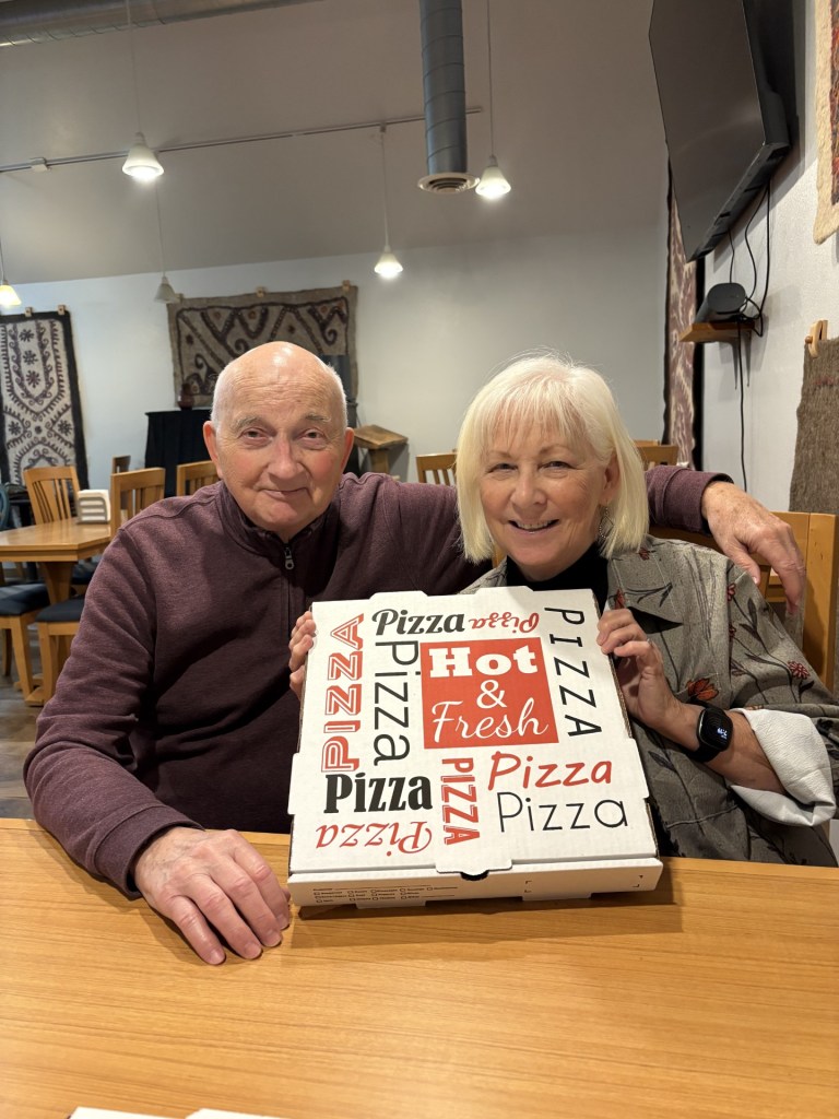 Here’s how we celebrated our 55th wedding anniversary. Are we “hot and fresh” like the pizza box says? We’d like to think so!