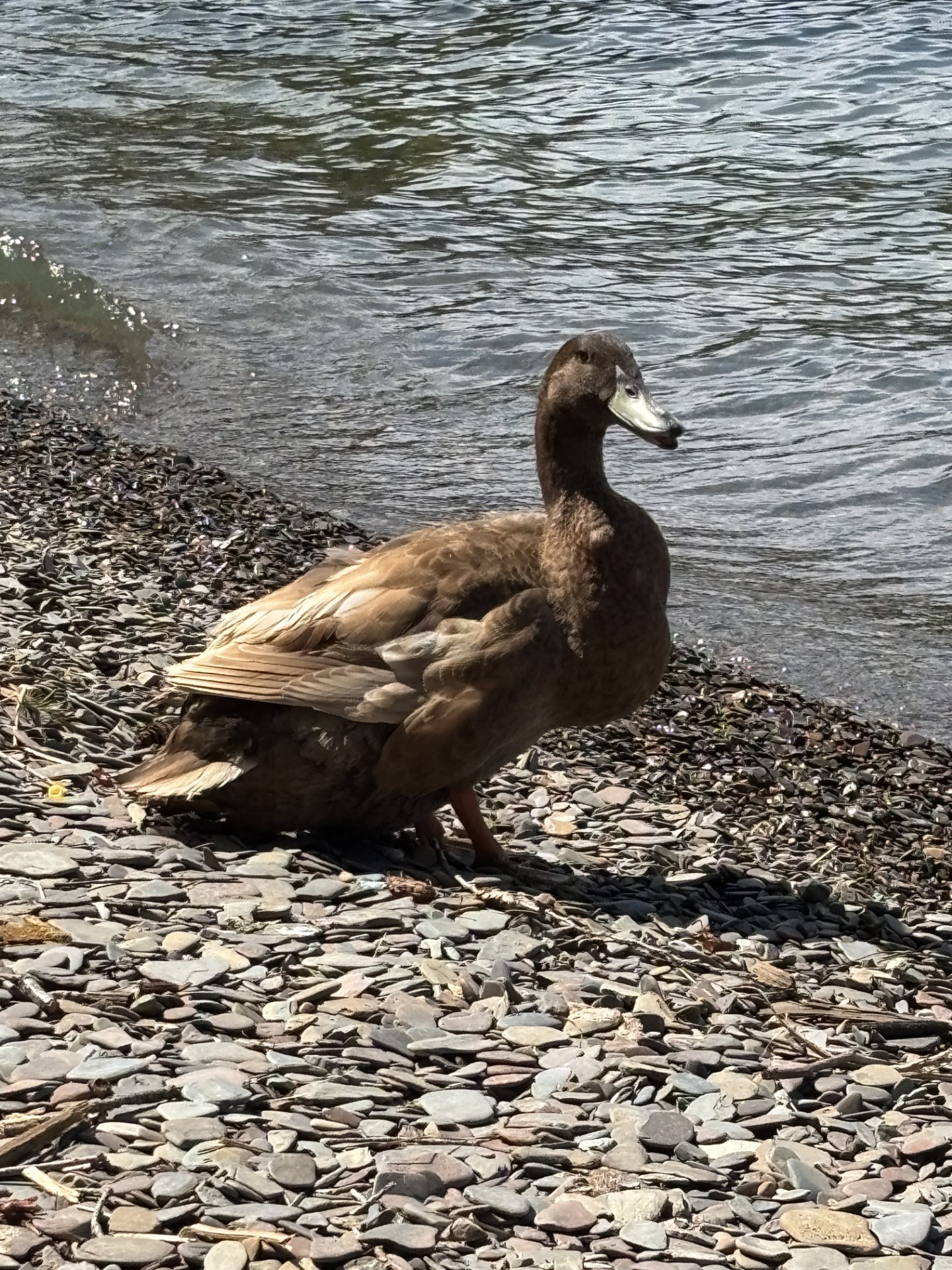 In the meantime, we tempt our funny visitor with duck food. She always quacks her thanks, letting me get within two feet of her twice a day (mealtimes). When she hears the back door open she hurries along the beach and waddles up the hill as fast as her little legs can take her. Comical!